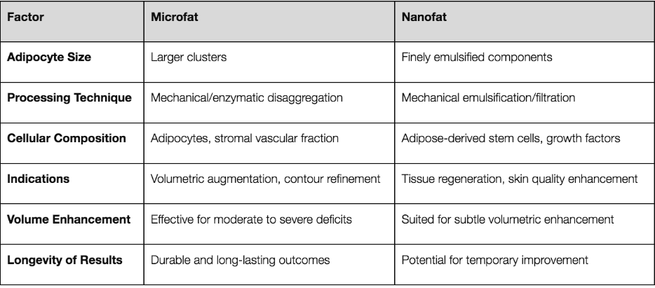 This table compares micro fat and nanofat grafting techniques, elucidating their differences in cellular composition, processing methodologies, and clinical applications. Understanding these distinctions is essential for clinicians seeking to optimize treatment strategies and achieve optimal outcomes in aesthetic medicine.