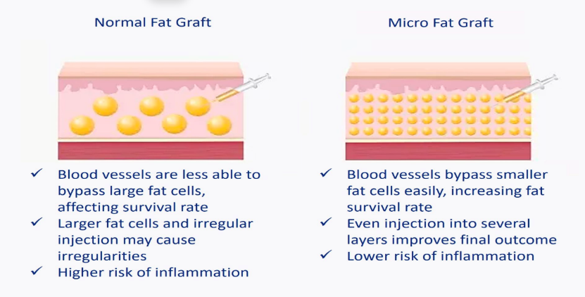 3. Durable and Long-lasting Results: Studies have demonstrated the durable and long-lasting nature of results achieved with micro fat Grafting compared to nano fat Grafting. The larger adipocyte clusters and intact ECM architecture of micro fat grafts contribute to enhanced graft survival, tissue integration, and resistance to resorption over time. Microfat grafts exhibit sustained volumetric augmentation and tissue rejuvenation effects, providing patients with enduring aesthetic improvements that withstand the test of time and aging processes.