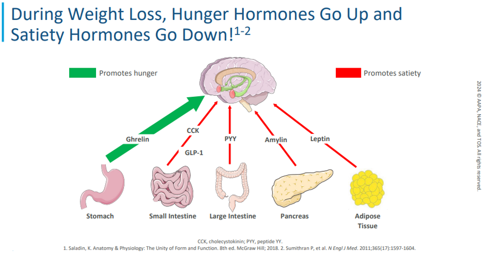 Hormones play a crucial role in regulating hunger. Ghrelin, released from stomach cells, increases appetite, while insulin and amylin, produced by pancreatic beta cells, help reduce hunger after eating. GLP-1 and other satiety hormones, such as CCK and PYY, also act on the hypothalamus to regulate food intake. In those with obesity, these hormonal pathways can become disrupted, leading to overeating and further weight gain.