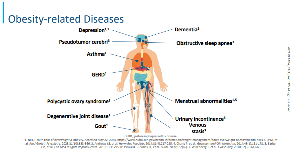 The consequences of obesity are severe and include hypertension, dyslipidemia, stroke, certain cancers (e.g., endometrial cancer), type 2 diabetes, and joint issues, among others. It can also lead to mental health challenges such as depression and conditions like polycystic ovarian syndrome (PCOS).